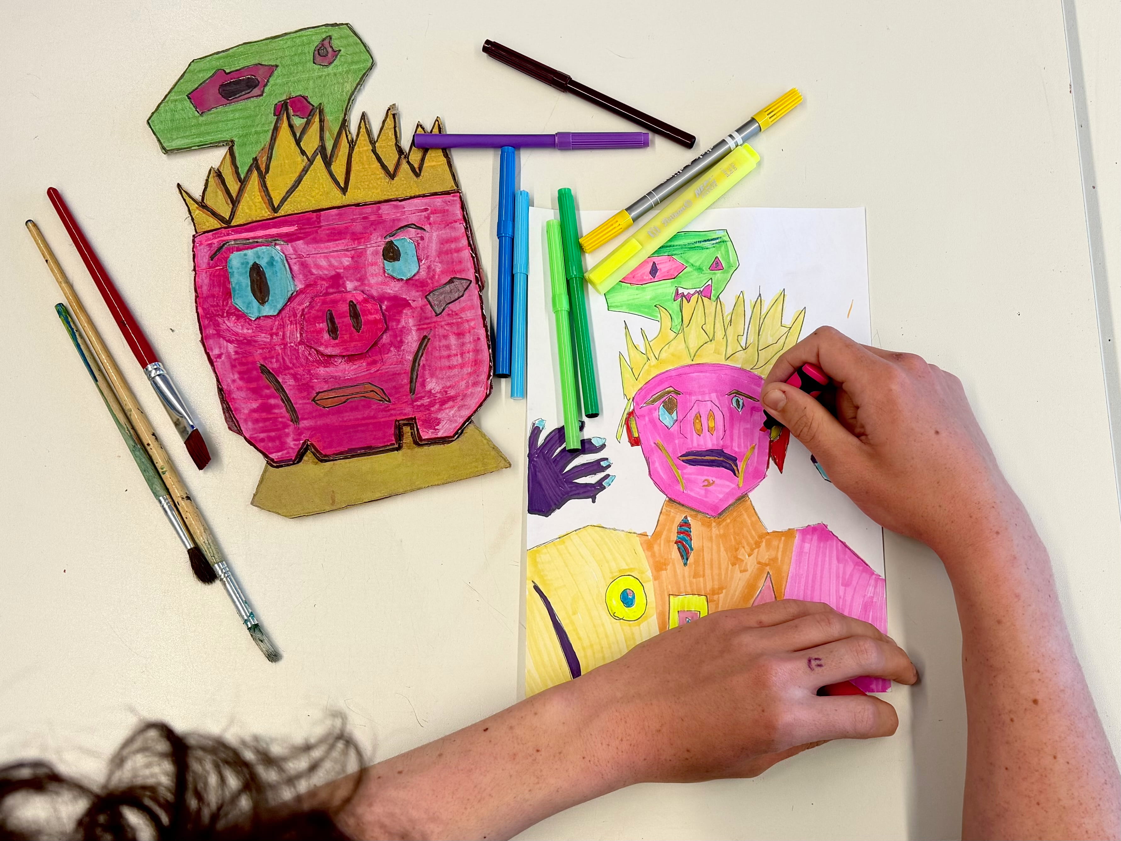So entstehen Bilder, die nicht nur zeigen, wie jemand aussieht, sondern wie vielfältig und vielschichtig ein Mensch gesehen werden kann. In der Farbgestaltung, insbesondere in den Aquarellarbeiten, wird eine bewusste Auseinandersetzung mit Primär-, Sekundär- und Komplementärfarben deutlich. Es zeigt sich Mut in den Farbkombinationen, aber auch eine zunehmende technische Disziplin: Farbe wird nicht dem Zufall überlassen, sondern entwickelt sich zu einer eigenen Bildsprache. In einigen Arbeiten treten die für Aquarell typischen Transparenzen in einen spannungsvollen Dialog mit dichteren Farbschichten, was die Komposition zusätzlich bereichert. Ein besonderer Höhepunkt der Ausstellung ist das Projekt der neunten Klasse: die Gestaltung von Karnevalswagen. Diese Werke, gefertigt aus Karton, Holz, Farbe und dekorativen Elementen wie Blumen, zeigen eine bemerkenswerte Verbindung von Kreativität und handwerklichem Können. Über das lebendige, farbenfrohe Erscheinungsbild hinaus wird ein starkes Engagement im Arbeitsprozess sichtbar: Sorgfalt im Detail, Sauberkeit in der Ausführung und die Fähigkeit, einfache Materialien in ausdrucksstarke Formen zu verwandeln. Die Schülerinnen und Schüler der zehnten Klasse präsentieren hingegen ein zeitgenössisches und konzeptionell interessantes Projekt: das Design von Tattoos. Jede Arbeit ist für verschiedene Körperstellen, Gesicht, Rücken oder Beine gedacht und zeigt ein Verständnis des Körpers als künstlerische Fläche. Hier erhält die Zeichnung eine intime und symbolische Dimension; die gewählten Motive erzählen von Identität, Zugehörigkeit und persönlichen Geschichten. Besonders bemerkenswert ist die Art und Weise, wie die Formen an die jeweilige Körperstelle angepasst werden und die Anatomie in den Gestaltungsprozess einbezogen wird. Insgesamt ist Ich bin kein Picasso nicht nur eine Ausstellung von Ergebnissen, sondern ein Zeugnis des Lernens als Prozess. Über die verschiedenen Jahrgangsstufen hinweg wird eine klare Entwicklung sichtbar: von ersten, tastenden Versuchen hin zu komplexeren und konzeptionell durchdachten Arbeiten. Die Technik verbessert sich, doch noch bedeutender ist das wachsende kreative Selbstvertrauen. Jedes Werk scheint zu sagen: „Das ist, was ich sehe. Das ist, was ich kann. Und das ist, wohin ich mich entwickeln möchte.“ Diese Ausstellung leistet etwas Wesentliches: Sie würdigt den Unterricht als einen legitimen Raum künstlerischer Praxis. Hier geht es nicht um sofortige Genialität, sondern um Respekt vor dem Prozess, vor Neugier, Experimentierfreude und Engagement. Vielleicht liegt genau darin ihre größte Stärke: Sie erinnert uns daran, dass Kunst nicht mit einem Picasso beginnt, sondern mit jemandem, der den Mut hat, zum ersten Mal eine Linie zu ziehen.